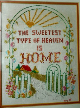I enjoy a little local travel and a nice vacation every now and then … but I am very much a “Home Body.” I love my home and as an author I now have the pleasure of working from my home. As a young girl I was blessed to grow up in a loving, happy home. We lived in a small house in rural suburbia on a quiet dead-end street. All the neighbors knew each other, the kids played together and I cherish fond memories of those early years in South Knoxville near Mooreland Heights School in the old Dogwood Trails area. I relate easily to stories like Dorothy in the Wizard of Oz, Wendy in Peter Pan, or Thumbelina yearning to go home again….and I always loved slogans like “There’s No Place Like Home” … “Home is Where the Heart Is” … and “The Sweetest Type of Heaven is Home.” In the 1970s after I married, I embroidered a sampler with those words on it which I still have hanging in my dining room.