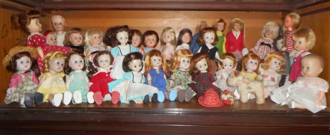 Because I played outdoors so much, I’m sure I collected many outdoor treasures in my romps around the countryside. I remember making a “leaves” book with all the different leaves I collected one summer. I collected Betsy McCall paperdolls, too, from the back of Mother’s McCall’s magazines every month. Neither of these collections cost me anything but they were fun. I also collected small character dolls I received for birthdays and Christmas over the years…. Madame Alexander dolls, Ginny dolls, Betsy McCall dolls, a Miss Revlon and a Bob doll, and some Skipper dolls.