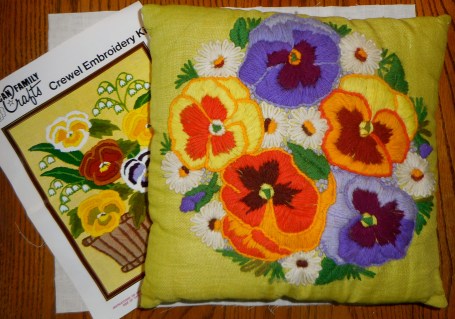 Looking through my old embroidery basket, while working on this blog, I found several items partially begun and unfinished, plus a set of cute kitchen items I worked in crewel, with a lot of French knots, that I always meant to frame. Also in the old basket were colorful embroidery floss and crewel yarn, my old embroidery hoop, linen fabrics, patterns, and a kit for a crewel pillow covered in pretty wildflowers I bought but never began.