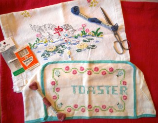 Later, I checked out books about the craft in my local library to learn more about embroidery techniques. Most of the items I made in those early years were given away as gifts, but a few years back—while cleaning out my mother’s sewing after she passed away—I found two samples of my childhood work Mother had saved, a toaster cover and a table runner. I laughed to find them. I doubt anyone would be caught dead with items like these in their homes today, but I couldn’t resist tucking them away in a drawer to keep, just as my mother did.