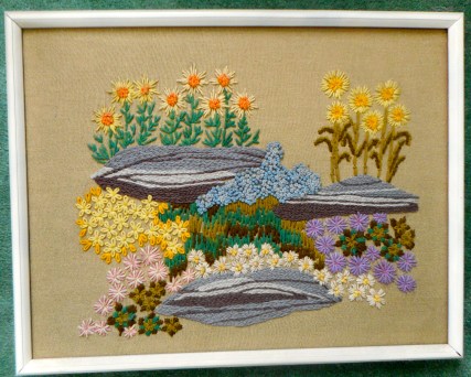 In the continuing busy years of childrearing and working, I only occasionally did embroidery again. The projects I took on were often larger more ambitious ones like the framed rock garden I sewed one winter. I began drawing my own original pictures for embroidery projects in those years, too, making personalized Christmas stockings, pillows, or framed embroidered scenes for family members.