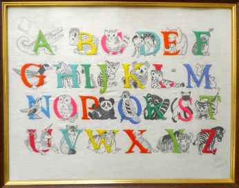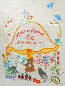 Before both my children were born, in addition to making crib blankets, baby pillows, toys, and some clothes, I stitched an embroidered sampler for each child’s room—one for Max of the ABC’s and one for Kate with her name on it. I’ve kept these for sentimental reasons like I’ve kept the children’s early drawings in their baby books.