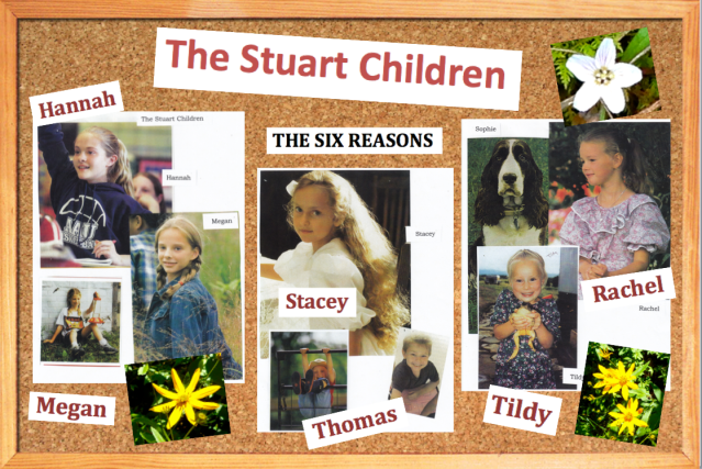 It was joyous fun to create the Stuart children. By the time I fully developed each child in age and personality, and saw them through the storylines and conflicts of FOR SIX GOOD REASONS, my heart grew bonded to these kids—as if I’d helped raise them myself. The Stuarts were great kids. The two oldest girls Hannah and Megan only twelve and ten, try so hard to be a help to Alice—wanting their family to stay together. Stacey, eight, outgoing and feisty, and little Rachel, seven, sweet and shy, are both heart-stealers. And the rambunctious, inquisitive five-year-old twins Thomas and Tildy constantly steal the show in the book, as little children of that age always seem to do. Thomas, in particular, with five older sisters is especially drawn to Harrison, and despite himself Harrison feels a pull toward Thomas, too, remembering being the younger brother of older sisters himself.