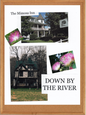 A fun note to remember about this book is that I actually dreamed the plot and story for DOWN BY THE RIVER—a first for me! My husband and I were heading through Townsend to hike one sunny Saturday and I looked over to see this charming turreted home for sale along the Little River. “Look at that gorgeous place.” I pointed toward the house. “Someone should buy it and open a shop or business there.” As we headed on to hike, I promptly forgot about the house, but a couple of weeks later, I woke up to grab a pen and paper to scribble down the story plot I dreamed about that very place. In the photo, you will see a picture of the actual turreted house on the river at the bottom of my bulletin board that inspired this story and then another modified photo above it of how I changed and enlarged the original house to accommodate a gracious bed and breakfast I named The Mimosa Inn.