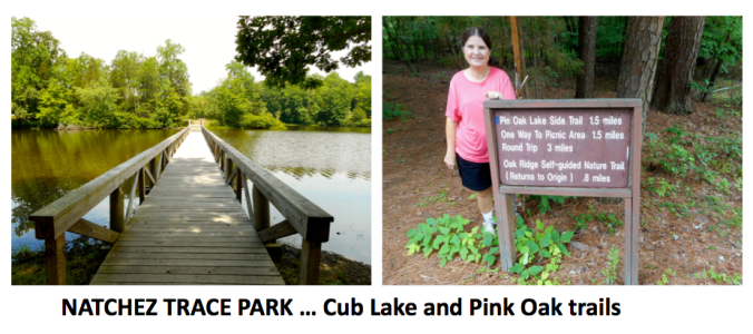 (1) At Natchez Trace, a vast state park, we stayed overnight in the beautiful park lodge and walked a number of the park’s trails, especially enjoying the long footbridge leading across Cub Lake and the quiet trails along the lakeside at Pin Oak Lodge.