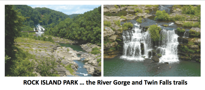 (1) The short Indian Rock House Trail in Pickett State Park in Jamestown, and the Hazard Cave and Hidden Passage trails, all leading to high rocky sandstone bluffs, unusual geological formations, and natural rock bridges. This park isn’t far from the Big South Park Recreation area either.