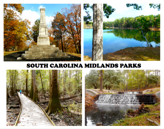 The midlands parks were spread out in a long region across the middle of the state, spanning from the GA to NC border, with Columbia, the state’s capital near the middle. Here we found more military parks like Kings Mountain, an interesting park dedicated to President Andrew Jackson, born in the state, another plantation site, the vast Congaree National Park, and an array of other rich state parks, each with its own special features. We especially enjoyed Chester State Park, Lake Wateree, and Dreher Island State Park, as well as the Sesquicentennial State Park near Columbia and Aiken State Park not far from downtown Aiken. We saw our first artesian well at Aiken and walked the long boardwalk trail out into the swampy floodplains at Congaree—and learned at Congaree the importance of always carrying bug spray.