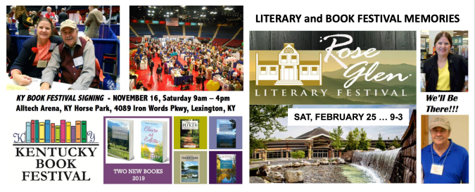 As an author I have participated in many different types of festivals—and I’ll be spotlighting some of these festivals we’ve attended in this blog with past photo collages in illustration. One more unique type of festival, that I have often been a part of as an author, are Literary Festivals and writing conferences or events that spotlight writers, where they sign their books and talk with readers and often speak about their work as well. I’ve attended festivals like these in North Carolina, Georgia, Kentucky and Tennessee. Two examples, you’ll see in illustration, would be the Kentucky Book Festival and the Rose Glen Literary Festival in Sevierville, TN.