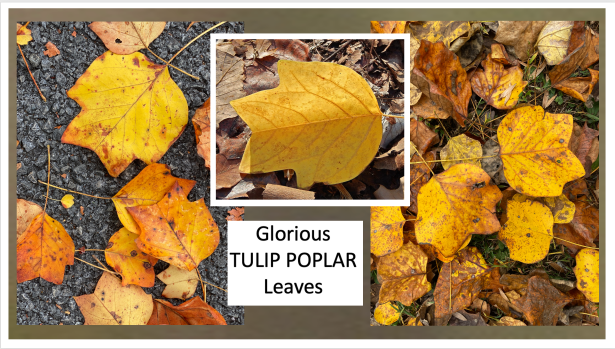 A tree I love in the fall landscape … and in my own backyard, too… is the beautiful, often towering, Tulip Poplar, which is also Tennessee’s State Tree. A common, big, straight-growing tree, it has leaves that are easy to recognize because they form a “tulip” shape, somewhat flat across the top with two side lobes. The tree produces pretty greenish-yellow flowers in spring, followed by cone-shaped fruit clusters, and in the fall the leaves turn a rich yellow, gradually deepening to yellow orange. In the parks around our home, and in the Smokies, the Tulip Poplar trees often create a yellow wonderland to hike through in the fall, often growing thickly together.