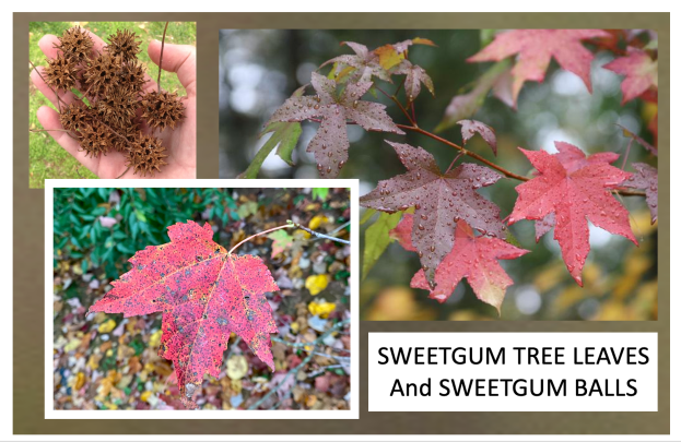 Often you can recognize trees not only by their leaves but by their nuts, seeds, or berries. The Sweetgum tree is one of those. Its pointed lobed and toothed leaves are somewhat star-shaped. Sweetgum leaves turn red and purplish-red in fall and you can often find the tree’s round, spiny “sweet gum balls” nearby, the tree’s fruit, containing the seed. Young Sweetgum trees don’t produce Sweetgum balls at first but the trees start producing them later as they age.