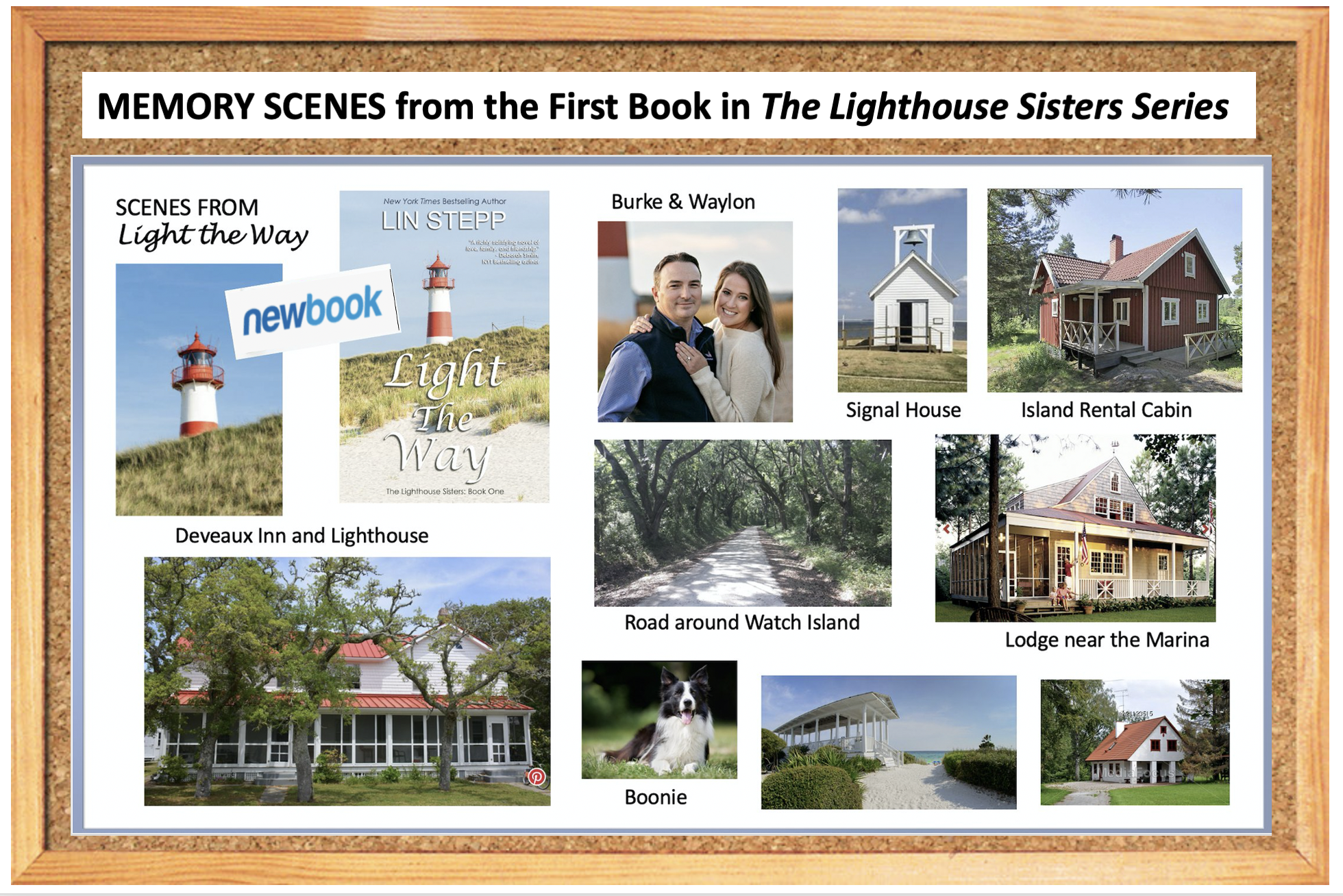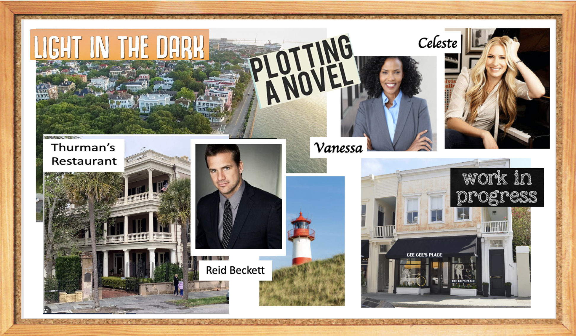 Over time I developed my main characters and side characters, my setting, homes, businesses and the general plots for each book. As the characters and places came to life in my mind I found pictures to match how I saw my “book people” and “book places” and soon created a collage bulletin board to prop beside my computer desk… so I could see all the photos as I worked for inspiration. My primary characters were the four sisters and Ella Deveaux, their mother and owner of the Deveaux Inn and Light Station owner, who had lost her husband in the last year. As the story begins, the oldest daughter Burke is still living at home, helping her mother run their inn and business, and giving tours of the lighthouse as her father had done before. Her sister Lila had come home after their father’s death, and she was helping, too, especially in running the lighthouse gift shop. As the first book moves along, focusing on Burke’s life, who has, by necessity, taken on many of her father’s roles, you come to know the family, the island, and the coastal area around Edisto. As Easter nears in the story, another sister, Gwen, who had been living in Arkansas with her husband and children, shows up unexpectedly, her marriage in trouble. As the family continues not to hear from Celeste, the third sister, a well-known country singer, who lives in Nashville, Gwen and Burke head to Nashville, concerned. They find Celeste, only recently home from hospital, after being beaten and abused by her husband, so they load her up to bring her home for rest and recovery.