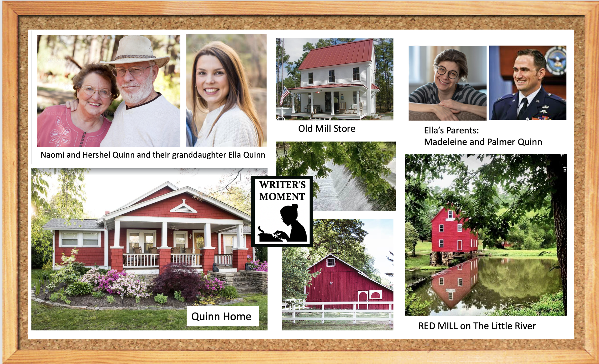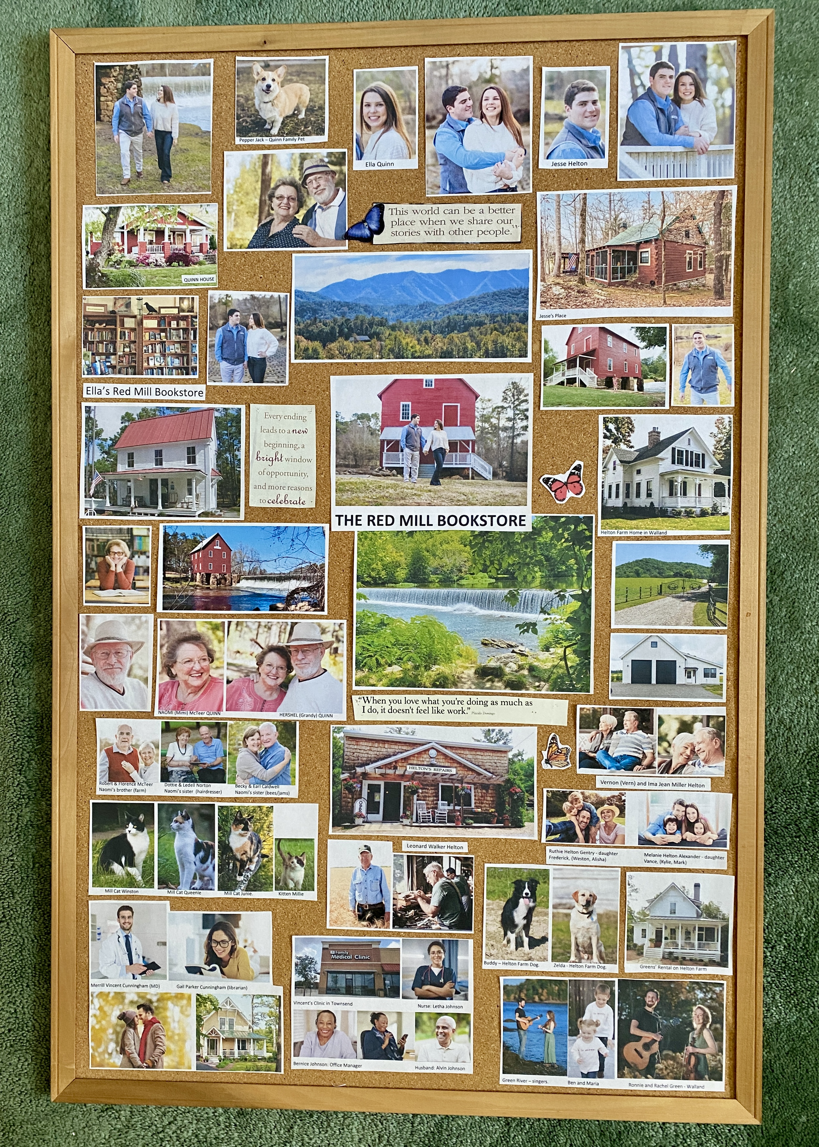 When all the research and planning was done and the book was outlined in plot and action, I created and put up my Collage Board, showing an array of pictures of the characters and places in my book. I love glancing up at all the pictures on my board, which I prop behind my computer, while I work. They make me feel I’m right among them all, can hear and see them. I especially liked Dr. Merrill Cunningham I created for this story and his wife, Gail, and the idea of the small-town doctor who still knows his patients well, and it was fun to create Ronnie and Rachel Green, and their bluegrass singing group Green River. Pets found a place in the story, too with Quinn’s corgi Pepper Jack, his name inspired from one of my fan’s daughter’s little dog, and with the Mill Cats.