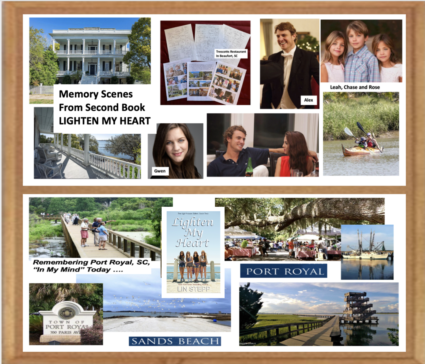 I won’t tell more as my books are full of rich story, problems, joys, and conflicts that will make you feel you’re right there at the Deveaux Inn and Lighthouse with all the characters. Gwen’s story is told in the second book, LIGHTEN MY HEART, and you will really see Gwen’s pain over the betrayal in her life and suffer with her and the children as they try to find their way, leaving their home in Arkansas and all they know. Gwen is a teacher and as she makes the decision to stay in the area and to find a teaching job and make a new life, she decides, early in the story, to accept a job at a school in Port Royal, a charming, historic community right below Beaufort. She finds a townhouse to rent near her new school, and then, with shock, runs into her husband, Alex Trescott, in Beaufort. Apparently, with the Arkansas restaurant where he worked closing, he’d come home to work again in his family’s restaurant, Trescott’s, in downtown Beaufort. It’s a memorable scene! I think readers will enjoy visiting in Beaufort and Port Royal where many scenes in this book are set … and struggling through Gwen and Alex’s problems of separation. Old characters from the first book thread through this story plus many new side characters and conflicts, making it an engaging and fun read, with the children’s stories mixed in.